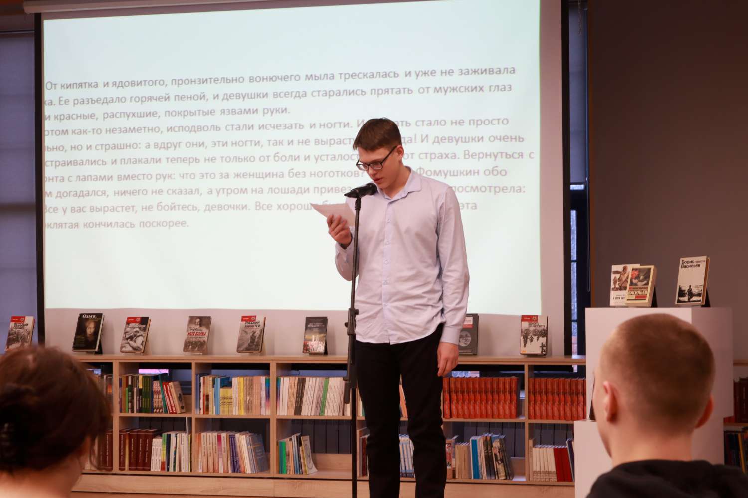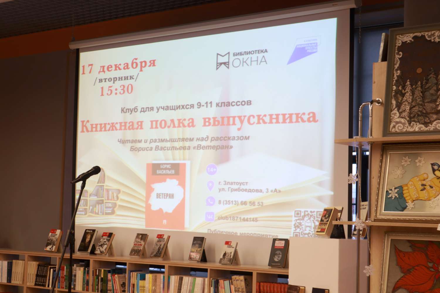 17 декабря в библиотеке нового поколения «Окна» прошла очередная встреча из цикла «Книжная полка выпускника», посвящённая Дню героев Отечества. На этот раз учащиеся читали и обсуждали рассказ Бориса Васильева «Ветеран». Негласной темой «Книжной полки» была – «Неприметные герои».